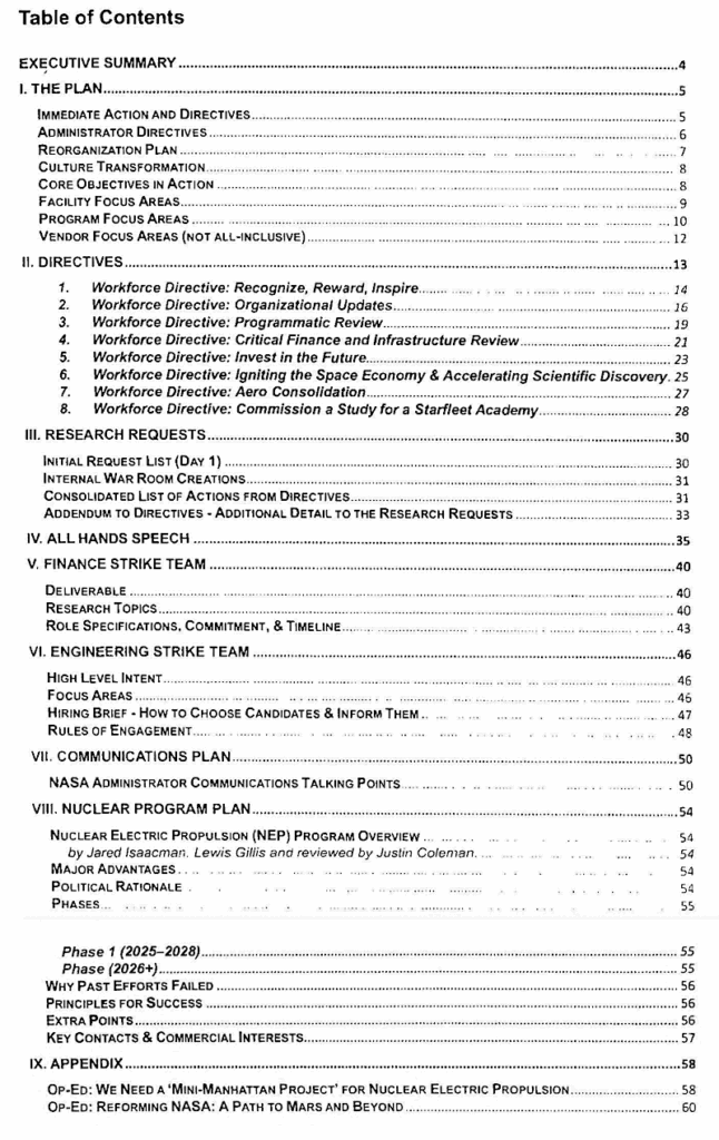 Keith’s note: A few weeks ago the existence of a “Project Athena” document prepared by NASA Administrator nominee Jared Isaacman and a few close advisors emerged. It had been written during his first nomination period as a shopping list, statement of purpose, first stab at a plan that he was working on for NASA. Then his nomination was pulled. Then it was reinstated. Now it will most likely stick. In the months between this report’s writing and today, much has happened that will nullify, modify, and/or accentuate most aspects of what was written. After its existence became known Isaacman wrote a summary of this summary to clarify a few things. But the actual document remained elusive until it started popping up on various social media accounts on Friday. I have excerpted two main features – the “Workforce Speech – Day 1 Speech”, and “Executive Summary”. You can download the PDF version of the full 62 page document that is circulating here on Google Drive or look at various Twitter and social media accounts for screen grabs and other links. BTW the cover says “Confidential/ Proprietary Information” – well that is moot now – but it was leaked from within a very very very small group of people at NASA who had copies. People leak things for their own purposes. This is a work in progress, subject to wholesale revision and even deletion, so caveat emptor, your mileage may vary, and ad astra y’all. Excerpts below.