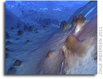 “Photosynthetic microbial mats forming large conical structures up to half a meter tall have been discovered by astrobiologists in Lake Untersee, Antarctica. This research is described in a forthcoming article in the journal Geobiology. During the expedition, three members of the field team, Dale Andersen (SETI Institute), Ian Hawes (University of Canterbury), and Chris McKay (NASA ARC) explored the lake beneath its 3 meter thick ice-cover and discovered the large conical structures that dominate the under-ice landscape.”