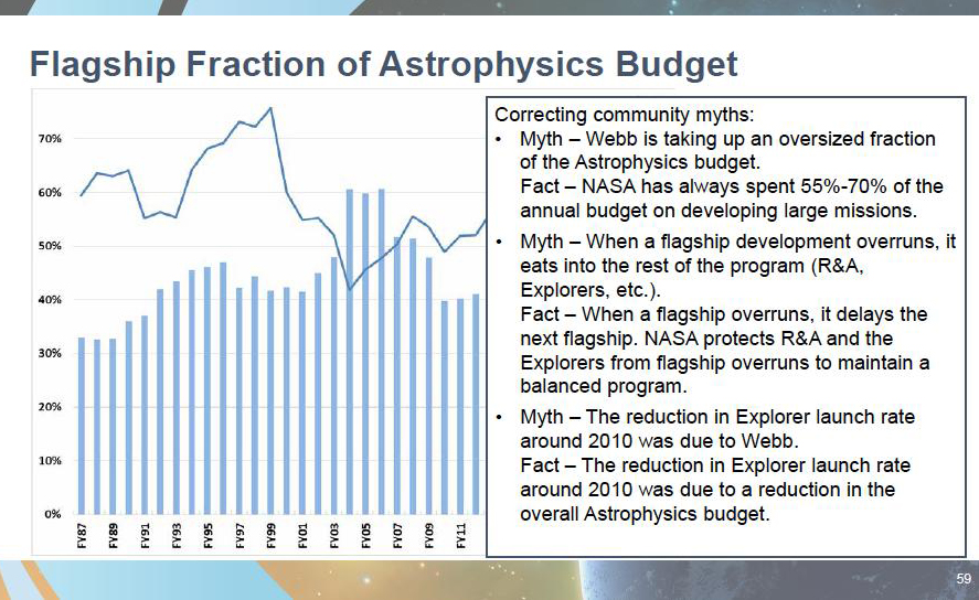 “NASA has always spent 55%-70% of the annual budget on developing large missions.” – See Chart 58. This statement is only about Astrophysics (that was clear in the context of the presentation, but it is not explicitly stated).