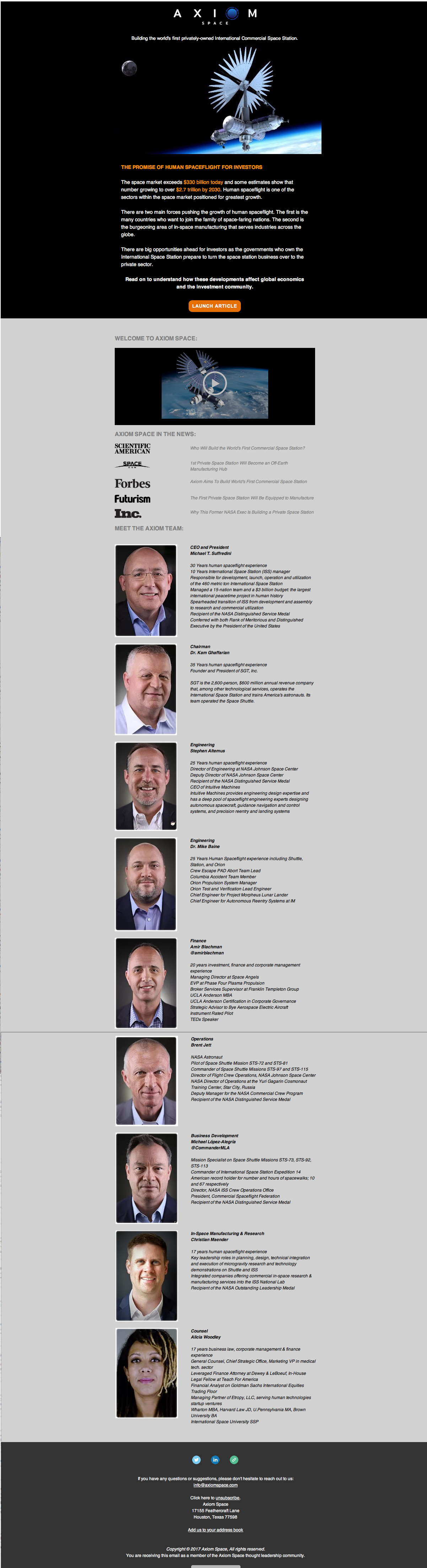 Keith’s note: I just got this advertising email from Axiom Space titled “The Promise of Human Spaceflight for Investors” bragging about Axiom being featured in lots of high visibility magazines. The email is slick, with nice portraits of the Axiom team – the faces they apparently want investors, the public, and the news media to see. I am certain that everyone is highly skilled, etc. But as I scrolled down this very long email something struck me: its all 50-something males. After eight of their smiling faces scrolled by there was a single woman – at the bottom of the list. Eight males, one female. I guess this is the optics that Axiom Space wants to put forward for their vision of the future human spaceflight.