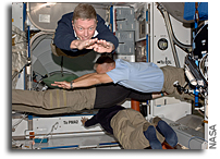“Four members of the joint STS-135/Expedition 28 crews are able to spend part of their last shared time onboard the International Space Station performing floating exercises that can’t be done in Earth’s gravity. Inside the Harmony Node 2 module, are NASA astronauts Mike Fossum (top), Expedition 28 flight engineer, and Doug Hurley, STS-135 pilot; and Ron Garan, Expedition 28 flight engineer. The crew member at bottom is partially obscured and is unidentified.”