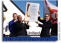Photo: NASA Administrator Charlie Bolden and KSC Center Director Bob Cabana sign the formal documents for the transfer of Space Shuttle Atlantis from NASA to the KSC Visitors Center.