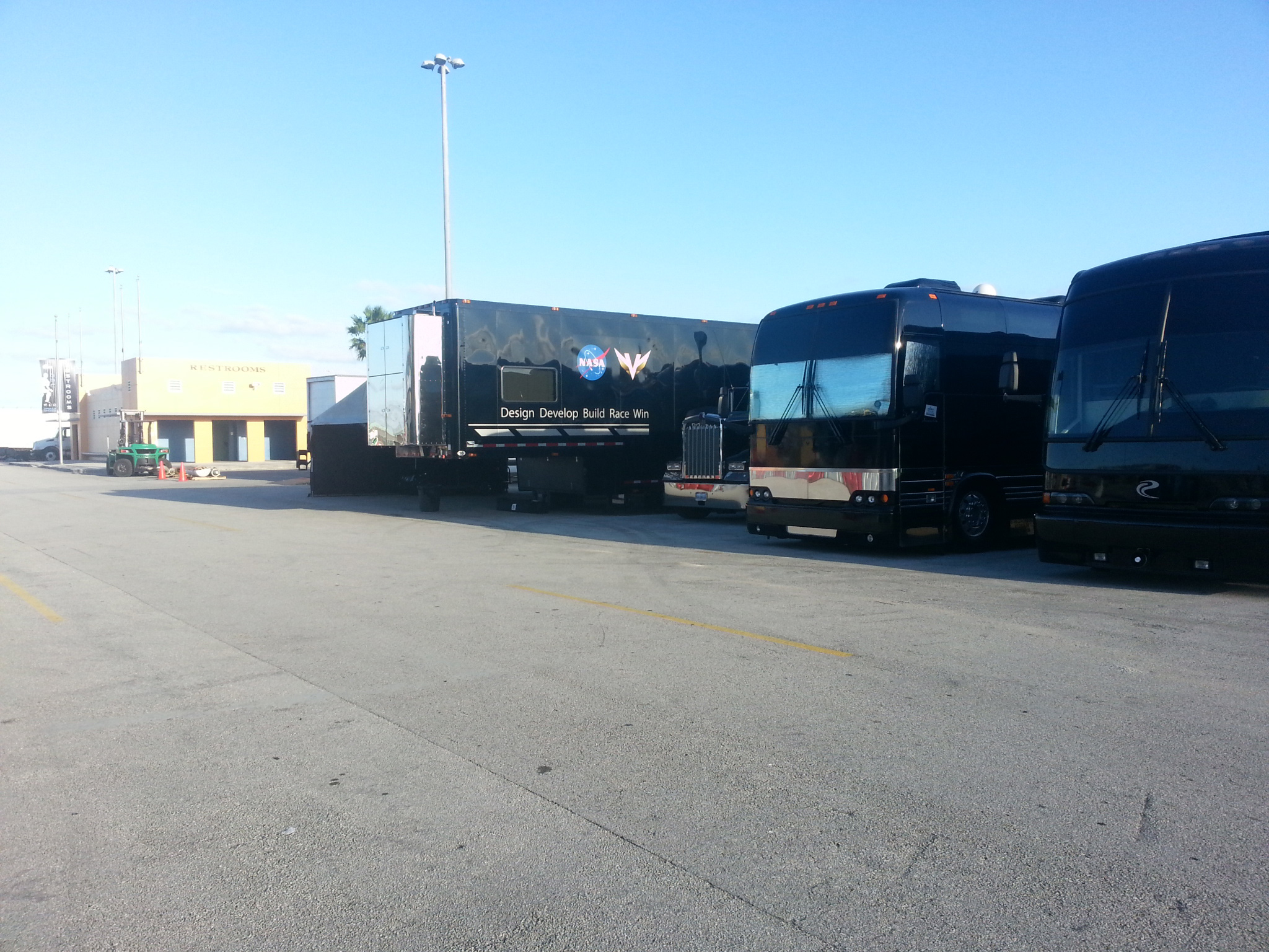 Reader note:“I was at the DRC all week. NASA showed up with the most awesome/expensive looking tracker/trailer. It had a custom paint job, new custom “pelican” cases for all equipment, a fold out tent on the side, and a $15K Cadillac golf cart (image). The team, if you view their videos had 50+ workers, a high-bay work area, a specialize sewing team and a seemingly unlimited tax payer funded budget. Here’s photo of it next to the Google buses.” Larger image